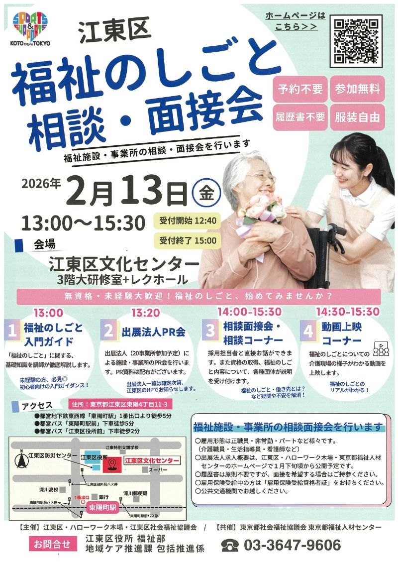 これから福祉の仕事を始めたい方、すでに働いている方、復帰を考えている方向けに、江東区では相談・面接会を開催します。江東区内の事業者が出展(20法人予定)…