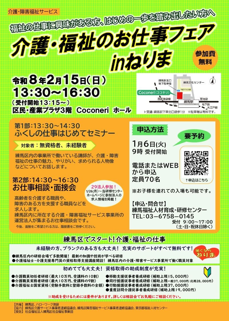 練馬福祉人材育成・研修センターが主催となり、ふくしの仕事はじめてセミナーとお仕事相談・面接会を開催します!場所はアクセス抜群の練馬区区民・産業プラザ3階…
