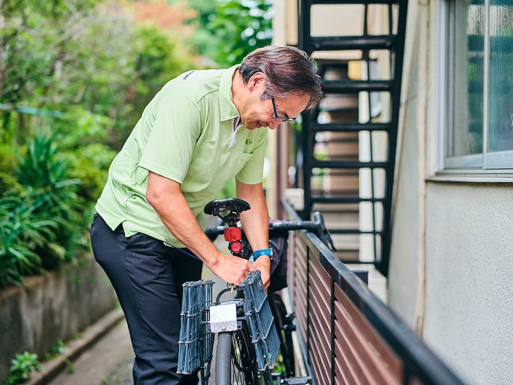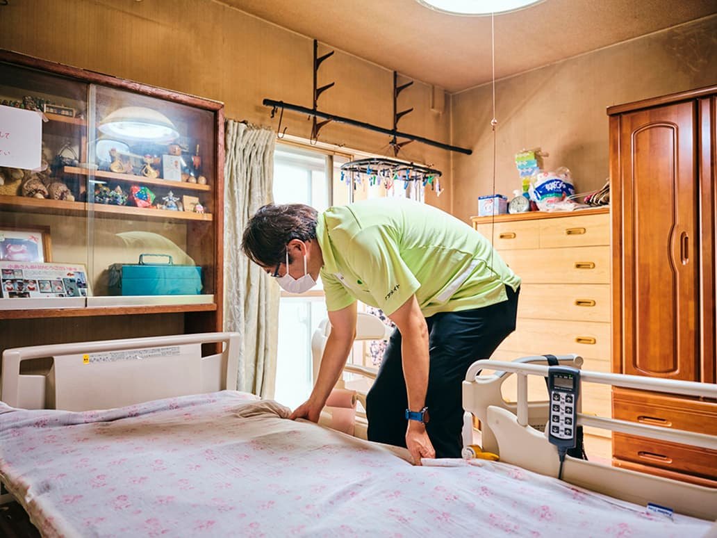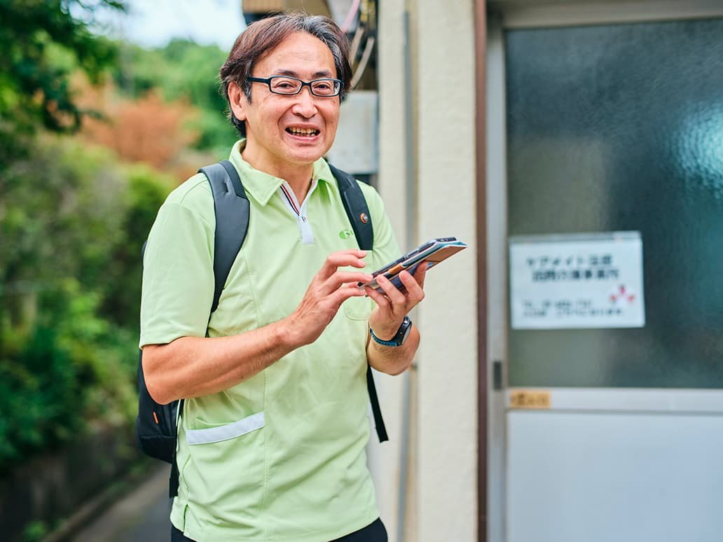 「背が高いので、ご利用者さんに威圧感を与えないよう、あえて腰を低くして接するように心がけています。」と山根さんは話します。その姿勢はご利用者様からも安心感につながり、信頼を集めています。