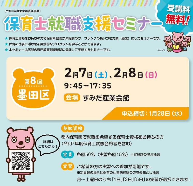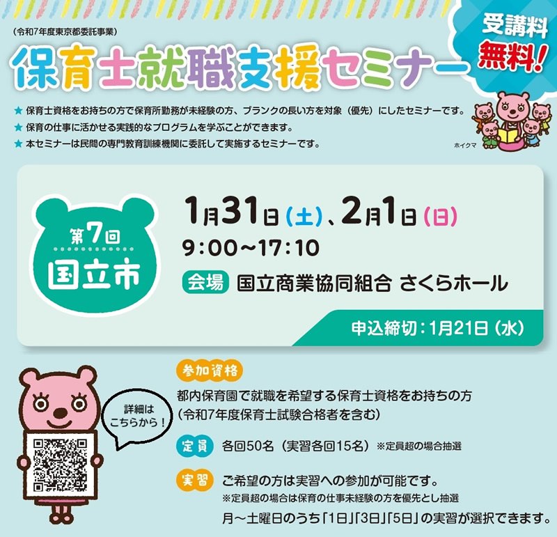 保育士資格をお持ちの方(保育士試験合格者含む)で保育所勤務経験が少ない方あるいは未経験の方、ブランクの長い方を対象(優先)にしたセミナーです。保育の専門…